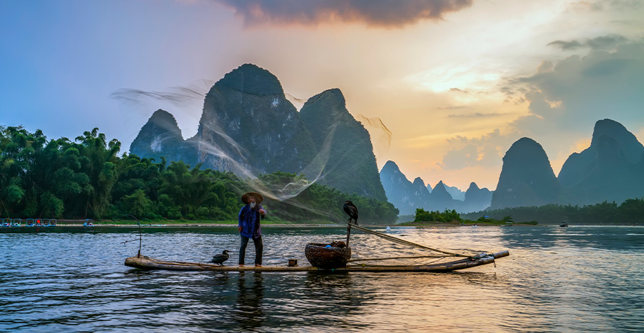Niedaleko Yangshuo odkrywa zupełnie inny świat - bajeczny krajobraz krasowych wzgórz, które od wieków zdobią chińskie zwoje malarskie. Rejs bambusową tratwą po rzece Li to jak wejście w obraz: cisza, mgła unosząca się nad wodą, sylwetki rybaków i bawołów na polach.